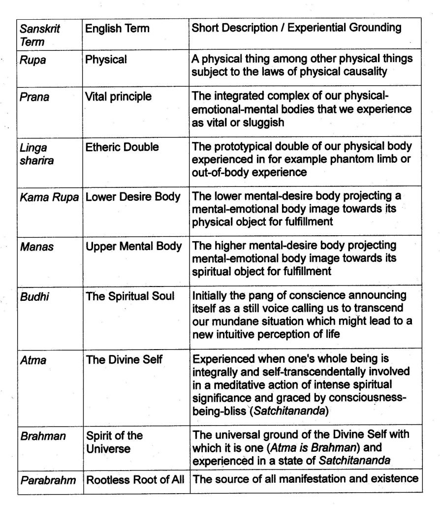 The following is a table of the Sanskrit and English terms, which I have extracted from several Theosophical sources (Blavatsky, 1892; Besant, 1909; Purucker, 1999). I added descriptions in a more phenomenological and experiential language to make a bridge to the level of lived experiences of mystics, especially Krishnamurti .